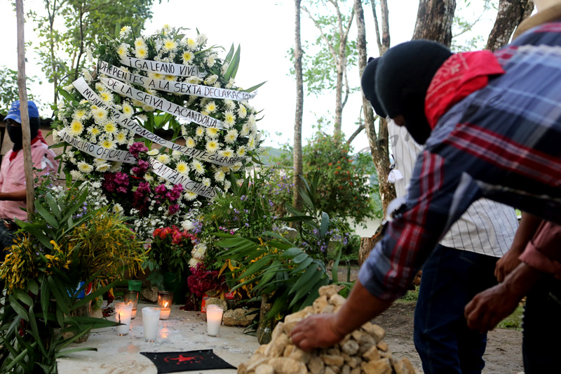 Zapatista supporters places stones Galeano’s grave in La Realidad during an homage to their fallen compañero, killed in a paramilitary attack against Zapatista members in La Realidad on May 2, 2014. Thousands gathered in La Realidad to show there digna rabia – or dignified rage, and demand justice and an end to the on-going violence directed towards Zapatista indigenous communities in Chiapas. The May 2nd attack was the first such attack directly in a Zapatista Caracol – or Cultural Center of Resistance and Autonomous Governance.