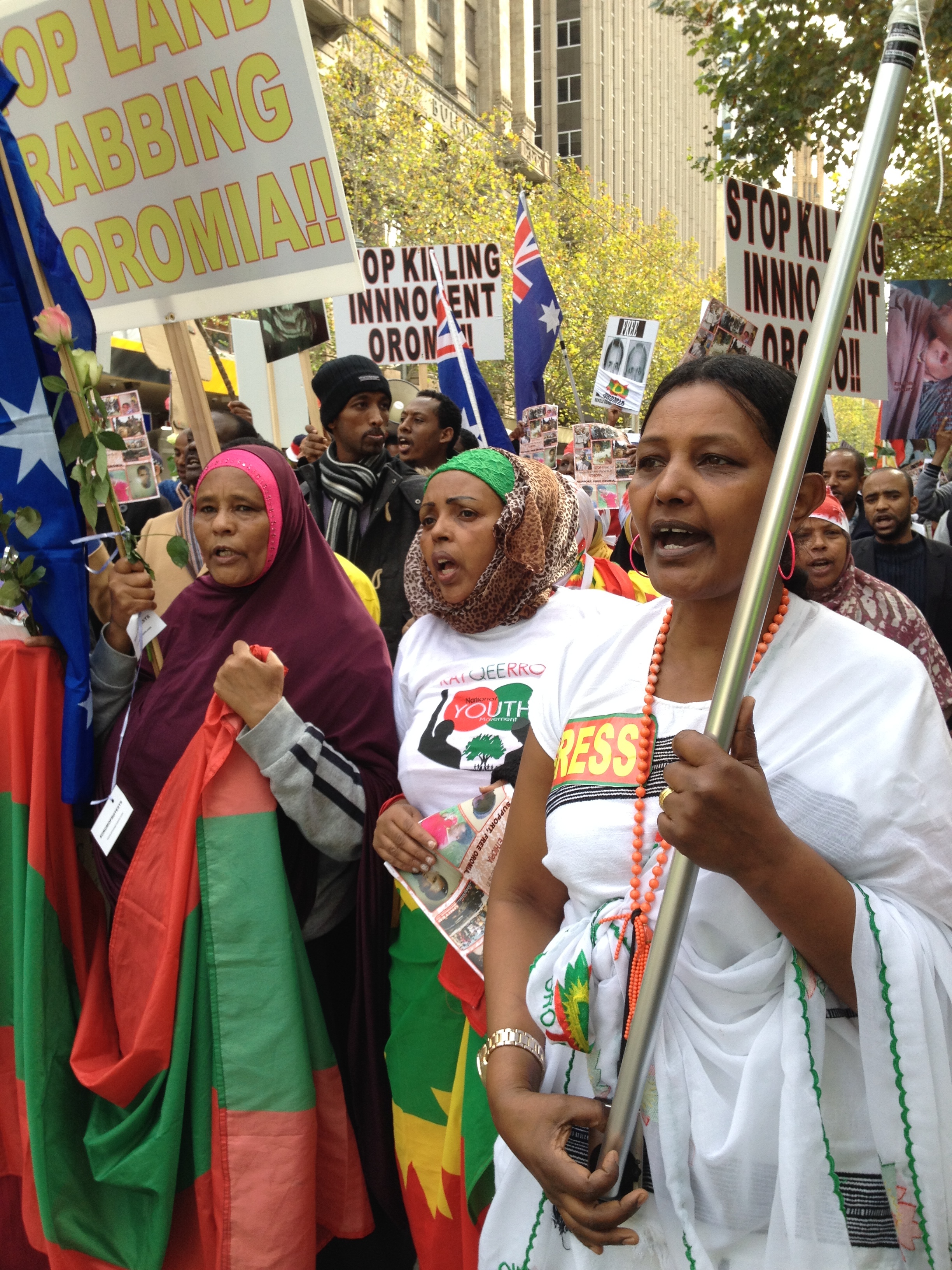 On a crisp Friday morning, a sea of green, red and yellow Oromo flags lines the streets of Melbourne. The city’s Oromo community is demonstrating to draw attention to human rights abuses facing Oromos back in Ethiopia. The protesters halt trams and cars, chanting and handing out fresh roses with tags quoting Martin Luther King JR’s famous words “injustice anywhere is a threat to justice everywhere.”