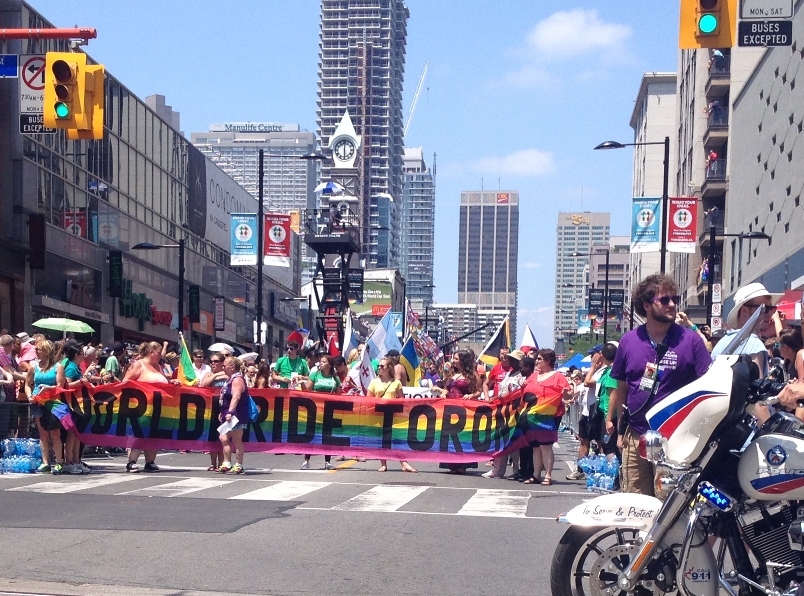 Toronto’s Pride Parade was a festive wrap-up to World 2014, an international festival of lesbian, gay, bisexual, transsexual, transgender, queer, questioning, two-spirit and intersex communities, and their allies. World Pride involved an estimated two million participants in ten days of cultural and educational events, parties, marches, a mass wedding, and the parade held on Sunday June 29th.