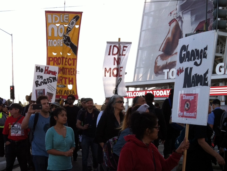 Football season is in full swing, as are renewed calls to change the name of the National Football League team from Washington DC. Earlier this year the U.S. Patent office canceled the trademark registration of the Washington Redskins on the grounds the team’s name is racially disparaging. About 75 to 100 Native American and social justice activists rallied at the 49ers and Redskins football game Sunday in Santa Clara, California. Activists are calling on the National Football League to end the use of racially charged words like Redskins for team names and to end the use of Native Americans as mascots in the league. FSRN’s Christina Aanestad reports.