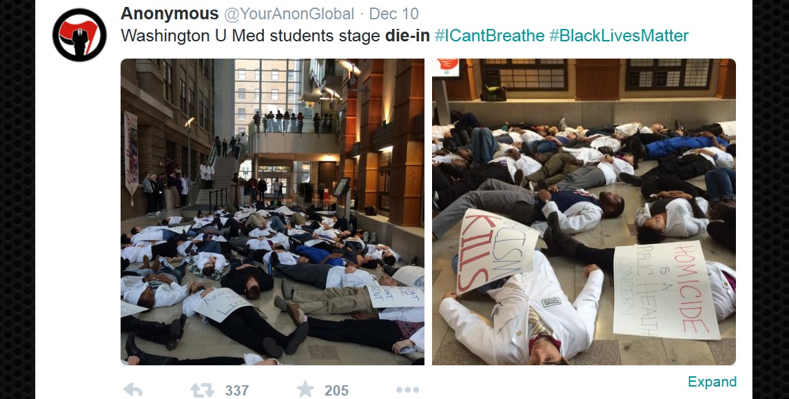 Medical students at more than 70 schools took part in white coat die-ins, expanding the narrative from the criminal justice system to the effects of systemic racism in the healthcare system. Environmental groups joined rallies, linking racial inequality to issues of climate imbalance and unsustainability. Congressional staffers took to the steps of the U.S. Capitol Thursday, with a Hands Up Don’t Shoot mass show of solidarity.