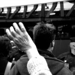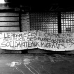 - “Capitalism is the epidemic along with its cops, its wars, its borders. Solidarity with migrants” says the banner under Paris metro near Koubri camp. The possibility of an epidemic was the reason authorities cited for dismantling the makeshift camp. (Photo Credit: Raphaël Krafft)