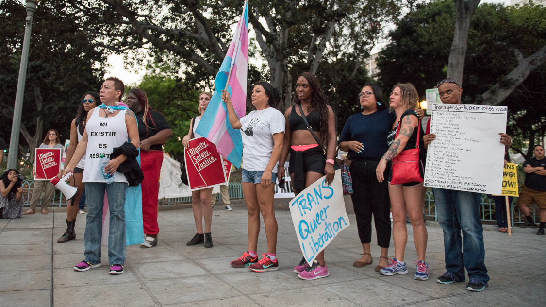 “Our lives matter,” chants trans activist Bamby Salcedo as she leads a rally in front of LAPD in response to the most recent murder of a transgender woman. “The lives and existence of trans people matter. And we are not going to take it any longer.”