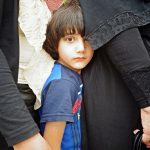 - An Iraqi boy stands in line behind his mother. The distribution of cash assistance is conducted in an orderly fashion with two separate lines separating the men from the women with children. (Photo Credit: Filip Warwick)