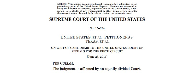 A four-to-four Supreme Court tie means the lower court’s action stands. In this case, the president’s efforts to expand Deferred Action for Childhood Arrivals, or DACA, and to implement Deferred Action for Parents of Americans, or DAPA, remain blocked and members of mixed immigration status families will not be granted temporary legal status.