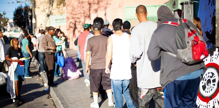 On Skid Row in downtown Los Angeles, about 20 volunteers with the Monday Night Mission distribute food to homeless residents. It’s early in the month, before their food assistance dollars run out, so the line is shorter – only about a hundred people tonight. It’s nothing fancy. A sandwich, bottled water, a banana.