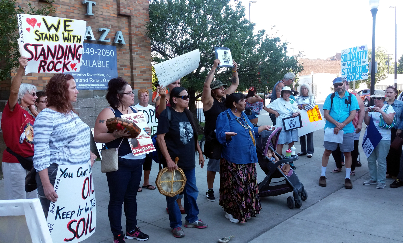 A crowd of about 50 people gathered in downtown Cleveland Tuesday, carrying signs saying We Stand With Standing Rock, “People Are Greater Than Pipelines, and the motto of the Standing Rock Sioux tribe — Water is Life. Their reasons for joining the action were varied.